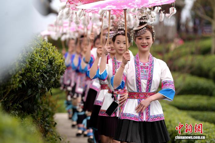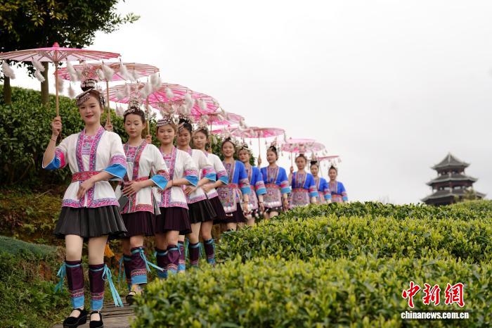 图为侗族女士正在茶园走秀。吴练勋 摄